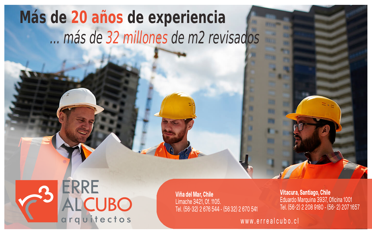 | NUESTRA EMPRESA ERRE AL CUBO Arquitectos S.A, es una sociedad dedicada a asesoría en materias técnicas urbanísticas y a la revisión independiente de proyectos de construcción, según lo dispuesto en el Art. 116 bis de la Ley General de Urbanismo y Construcciones. Conforme a la Ley 20.071, los socios estamos habilitados para operar como revisores independientes de primera categoría, lo que nos permite revisar proyectos de cualquier superficie. Actualmente operamos a nivel nacional, con sucursales en Viña del Mar y Santiago, y contamos entre nuestros clientes a importantes compañías del ámbito inmobiliario, residencial y de equipamiento, lo que a la fecha nos permite haber revisado más de 32.000.000 m2 edificados o en construcción. | ||